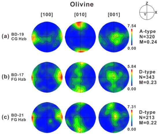 Pole figures showing the lattice preferred orientations (LPOs) of olivine from coarse-granular (CG) and fine-granular (FG) harzburgite (Hzb) from the Baekdusan peridotites. (a) The LPO of olivine in coarse-granular peridotite (BD-19). (b,c) The LPOs of olivine in fine-granular peridotites (BD-17, BD-21). The east–west direction corresponds to the stretching lineation (X), and the north–south direction (Z) is normal to the foliation. Color-coding represents the density of data points. Equal-area lower-hemisphere projection was used with a half scattering width of 20°. N indicates the number of grains measured. Olivine fabric (LPO) strength is denoted by M (M-index) [42].