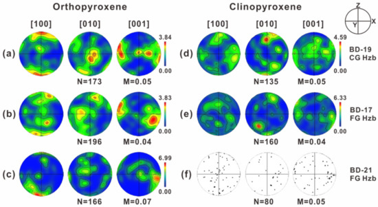 Generally, the fabrics of orthopyroxenes (Figure 6a–c) are much weaker than those of olivine in our samples (Figure 5). The LPOs of orthopyroxenes from both the coarse- and fine-granular peridotites exhibit alignment of the [100] axis subnormal to the foliation, whereas the [001] axis is aligned subparallel to the lineation (Figure 6a–c). This is a characteristic of the type-AC LPO of orthopyroxene [53]. The LPOs of clinopyroxenes are illustrated in Figure 6d–f, in which the fabrics of clinopyroxenes are relatively weak. The LPOs of clinopyroxene typically indicate alignment of the [010] axis subnormal to the foliation (Figure 6d,e) and alignment of the [001] axis subparallel to the lineation (Figure 6d–f). This is considered a conventional characteristic of the LPO of clinopyroxene in naturally deformed rocks [43,44]. The fabric strengths (i.e., M-index) of orthopyroxenes (0.04–0.07) and clinopyroxenes (0.04–0.05) are weaker than those of olivine in our samples (Figure 5 and Figure 6).