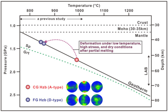 A summary figure showing the relationship between olivine fabrics and deformation conditions in the Baekdusan peridotites. The equilibrium temperatures are projected onto the geotherm (solid line) of the Bohai Bay Basin in the NCC [74]. The spinel (Sp)–garnet (Grt) phase transformation (green dashed line) is from O’Reilly and Griffin [76]. The crust–mantle boundary (Moho) depth (30–35 km; black dashed lines) and lithosphere–asthenosphere boundary (LAB) depth (50–70 km) beneath the Baekdusan volcano are from Kim et al. [75]. The equilibrium temperature range indicated by previous data from the Baekdusan peridotite xenoliths is also shown [21]. Coarse-granular (CG) and fine-granular (FG) harzburgite (Hzb). Representative A-type and D-type LPOs of olivine from BD-19 and BD-17, respectively.