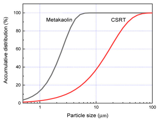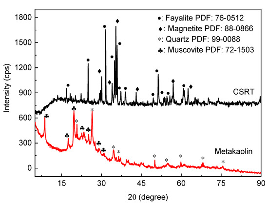 Copper mine tailings were obtained from the copper slag reprocessing tailings of Zijin Shan, Longyan, Fujian province, China. Kaolinite was purchased in Wuhan, Hubei province, China, which was used to prepare metakaolin through calcination at 800 °C for 6 h. Figure 1 gives the size distribution of the CSRT and metakaolin measured by a laser diffraction analyzer (LS-CWM, Omec, Zhuhai, China), in which the d50 and d85 are 16.81 and 36.71 µm for CSRT, and 2.38 and 3.52 µm for metakaolin, respectively. Table 1 shows the chemical composition of the CSRT and metakaolin analyzed by an X-ray fluorescence instrument (XRF, Axios advanced, PANalytical B.V., Almelo, The Netherlands). The CSRT mainly contained SiO2 (28.19%) and Fe2O3 (57.83%), while SiO2 (52.67%) and Al2O3 (41.37%) were the main components of the metakaolin. Figure 2 shows the main components of the CSRT and metakaolin characterized by X-ray diffraction (XRD, D8, Brucker, Karlsruhe, Germany). The CSRT mainly contained magnetite and fayalite, while metakaolin showed an amorphous peak at 2θ of 15–30° and crystal phase in quartz. Sodium silicate (ACS reagent grade), employed as an alkali activator, was bought from Aladdin Chemical Reagent (Shanghai, China) in the geopolymerization process. Deionized water was used throughout the whole process.