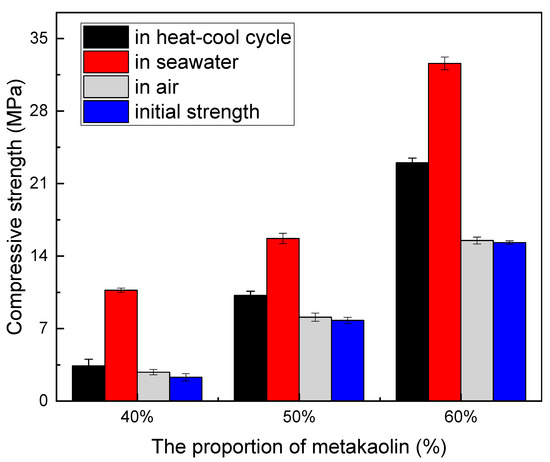 Figure 3 shows the compressive strength of CSRT-based geopolymers prepared with different proportions of metakaolin and different exposures. The initial geopolymers, cured for 7 days, had a compressive strength of 2.3 MPa, 7.8 MPa and 15.3 MPa when the proportion of metakaolin was 40%, 50% and 60%, respectively. The low value in compressive strength suggested that the CSRT had low activity in the geopolymeric reaction. Moreover, metakaolin was obviously advantageous to increase the compressive strength of the geopolymer. Compared to the initial geopolymers, the compressive strength of the geopolymers that were exposed to air for 30 days had no obvious improvement or lessening of strength. While for the geopolymers exposed to seawater for 30 days, the compressive strength increased significantly to 10.7 MPa, 15.7 MPa and 32.6 MPa with 40%, 50% and 60% of metakaolin addition, respectively. For exposure to heat–cool cycles of seawater, the increase in compressive strength of geopolymers was less than those in seawater, which were 3.4 MPa, 10.2 MPa and 23 MPa with 40%, 50% and 60% of metakaolin addition, respectively. These results show that the compressive strength of the geopolymers was improved when exposed to seawater, which is in agreement with previous studies. Sotya et al. reported that the compressive strength of geopolymers was not affected by seawater immersion [11]. Jin et al. found that cations in seawater (e.g., Mg2+ and K+) could diffuse into the aluminosilicate network structure of geopolymers to balance the negative charge, making the gel structure stable [13].
