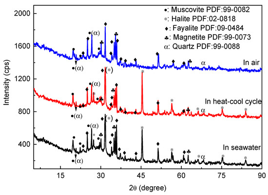 Figure 4 gives the XRD spectra of the geopolymers prepared with 60% metakaolin and which underwent different exposures for 30 days. Compared to the XRD patterns of raw materials (Figure 2), the crystal phases of quartz, magnetite, fayalite and muscovite remained after the geopolymeric reaction. While for exposure in seawater, the solution penetrated pores and precipitated halite (NaCl) was observed. The range of broad peak at 2θ of 15–30° in metakaolin transformed into 2θ of 22–35° in the geopolymers with different exposures, which indicates the formation of N-A-S-H gel [14,15].