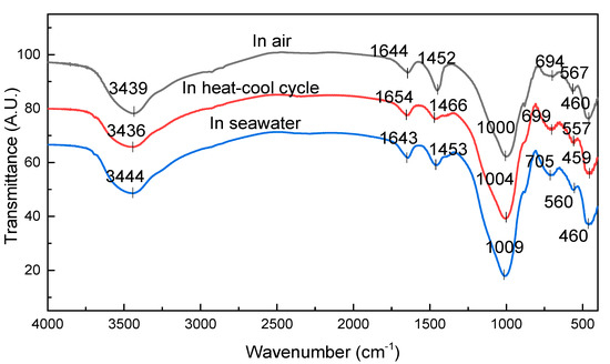 Figure 5 shows the FTIR spectra of geopolymers prepared with 60% metakaolin and different exposures. The absorption peaks at 3440 cm−1 and 1644 cm−1 are due to stretching vibrations of OH−, and H-OH bonds of free water, respectively, corresponding to adsorbed H2O in geopolymers [16]. The absorption peak around 1453 cm−1 is assigned to asymmetric stretching of O-C-O bonds in CO32− groups, due to carbonation in the curing and exposing process of geopolymers [17]. The peak at 699 cm−1 is the Si-O bonds in quartz, suggesting the quartz particles are insoluble in the geopolymeric reaction [18]. The absorption peaks at 560 cm−1 and 460 cm−1 represent the zeolite framework in the structure of the geopolymer [19,20], which indicates zeolite frameworks are formed during the process. The band at about 1000 cm−1 is the Si-O-T bonds (T represents the tetrahedral Al or Si) in the geopolymer gel [21]. It is sensitive to the Si/Al ratio in the geopolymer backbone, which could shift toward the lower wavenumber at a low Si/Al ratio [22]. The wavenumber transformation indicates the exposure in the heat–cool cycle and seawater, which changed the evolution of the N-A-S-H gel. In addition, the higher intensity for the geopolymers exposed to seawater than in the heat–cool cycle and in air, suggests the formation of higher proportions of N-A-S-H gel.