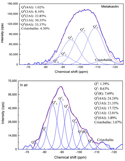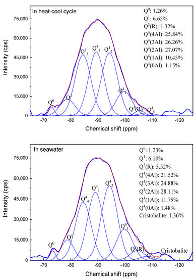Figure 6 gives the 29Si NMR spectra and deconvolution of the raw metakaolin and CSRT-based geopolymers prepared with 60% metakaolin and exposed differently for 30 days. Metakaolin predominantly peaked at around −105 ppm. After geopolymerization, the 29Si NMR lines shifted to less shielded values due to the geopolymeric reaction taking place to form N-A-S-H gel. For the geopolymers exposed to air, the heat–cool cycle and seawater, the Si sites in silicate monomers (Q0) are 1.39%, 1.26% and 1.23%, those in silicate dimer (Q1) are 8.63%, 6.65% and 6.10%, and in Q3(R) are 7.69%, 1.32% and 3.52%, but those in N-A-S-H gel (Q4(mAl), 0 ≤ m ≤ 4) are 79.21%, 90.77%, and 87.78%, respectively. The Si sites in Q0 and Q1 slightly decrease and those in N-A-S-H gel increase when the geopolymers are exposed to seawater, indicating that the Q0 and Q1 transformed into N-A-S-H gel. It has been reported that the compressive strength relies on the amount of Q4(3Al), Q4(2Al) and Q4(1Al) [27]. The percentages of Q4(3Al), Q4(2Al) and Q4(1Al) are 51.08%, 63.78% and 64.78% for the exposures in air, heat–cool cycle and seawater, respectively, which explained the variation in compressive strength of geopolymers. These results suggest that exposure in seawater promotes the geopolymerization process.