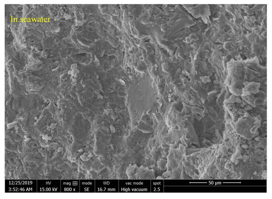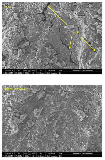 Figure 7 shows the SEM morphology of the geopolymers that underwent different exposures for 30 days. The geopolymers exposed to both the heat–cool cycle and seawater showed homogenous and compact structures, indicating geopolymers with 60% metakaolin can be consolidated well. However, cracks were exhibited in geopolymers exposed to air. This result further confirmed that more N-A-S-H gel was formed in the geopolymers that were exposed to both the heat–cool cycle and seawater, thereby bridging the cracks, and thus increasing their compressive strength.