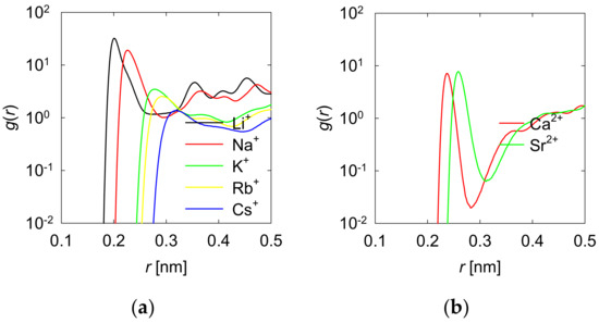 Cation radii with first hydration shell, , and from the RDF in Figure 2.