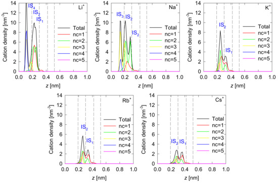 An inner-sphere surface complex has no water molecule present between the surface functional group and the cation it binds, whereas an outer-sphere surface complex has at least one water molecule interposed between the cation and the surface [6]. The z-density function of spodumene and the RDF of alkali and alkaline-earth cations are used to identify cations that are adsorbed without the intermediation of water giving rise to inner-sphere complexes with a number of irreversible adsorption contacts with the spodumene surface. When the cation-spodumene distance falls in the range of distances covered by the first cation adsorption peak in the RDF (Figure 2), then the cation forms an inner sphere complex with the spodumene. The upper limit of the distance range for each cation corresponds to the minimum after the first peak or to the first inflection if no minimum exists. The average distance between each cation (M) and the oxygen on the (110) surface of spodumene (O- of the surface moiety) without water in between is shown in Table 1 as . The results compare very well with cation radii with first hydration shell, , which corresponds to the average of all available data either experimental or from computational simulation [39,40]. We do not consider Mg because it does not form inner-sphere complexes [41] with spodumene nor with other minerals such as quartz [42], corundum [42], kaolinite [43], and montmorillonite [44,45]. Mg only forms outer-sphere complexes [5,41,42,44,45]. The inner-sphere complexes occur with one, two, three and four adsorption contacts between the cation and the spodumene surface. Thus, the determination of inner-sphere complexes requires examining each adsorbed cation to verify that it complies with the upper distance limit defined by the RDF and to count the number of adsorption contacts. To automate this calculation, a simple algorithm was developed. The adsorption of cations as inner-sphere complexes was found mainly irreversibly and without clustering. For each ion, its connectivity with the oxygen atoms on the mineral surface is first determined from the RDF results and then its position on the z-axis. With these two values, the axial density profiles of the various metal complexes separated by connectivity are constructed.