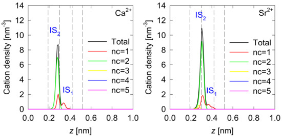 Figure 3 and Figure 4 show axial density profiles of inner-sphere complexes (ISC) conforming the first adsorption layer of each cation on the spodumene. The profile envelopes in these figures correspond to the total density of inner-sphere complexes. It should be noted that these envelope curves are slightly different from those recently published [5], because in the present work it was ensured that all the cations considered in the first adsorbed layer were inner-sphere complexes. The structure of the first layer is complex for alkali cations and somewhat less complex for alkaline-earth cations.