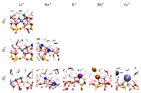 Small cations like Li+ and Na+ form ISC with 3 (IS3) and 4 (IS4) contacts with the mineral surface, these complexes are located between the surface and the first layer of hydration of the spodumene. For Li+, the density of IS4 is higher than the density of IS3, while for Na the density of IS3 is much higher than that of IS4. The cation layer is completed for Li+ and Na+ with ISC with 1 (IS1) and 2 (IS2) contacts adsorbed between the first and second hydration layers of the mineral; both cations show a doublet for IS2 and a singlet for IS1. For Li+, the densities of IS2 and IS1 are comparable; however, for Na+, the density of IS2 is much higher than that of IS1. Larger cations such as K+, Rb+, and Cs+ form ISC with 1 and 2 contacts, with the density of IS2 higher than that of IS1, much higher for K+ and Rb+, and slightly higher for Cs+. These large cations also form a few ISC with 3 and 4 contacts. The IS2 of K+, Rb+, and Cs+ are located exactly between the first and second hydration layers of the spodumene, whereas the IS1 of these cations are located between the second and third hydration layers.