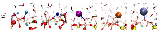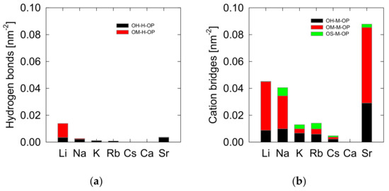 Figure 7 shows that oleate adsorption onto spodumene is low for all cations and occurs mainly through cation bridges (Figure 7b); hydrogen bonds are practically non-existent (Figure 7a). Adsorption through cation bridges decreases markedly with cation size for the alkali metal series. It does not exist in Ca; it is somewhat higher in Sr, although it barely exceeds one contact with the entire available surface of the spodumene slab used in the simulations. A detailed analysis of the interactions shows that cation bridges with alkali cations occur mainly through inner-sphere complexes with more than two contacts with the spodumene surface, i.e., IS3 and IS4, due to the charge of the cations involved is somewhat less neutralized than in complexes IS1 and IS2. Steric obstacles also limit the collector adsorption on these latter complexes because it simply cannot reach them. In the case of divalent cations, there are marked differences in adsorption between Ca and Sr cations. The small size of Ca allows it to access the nooks and crannies on the spodumene surface, where the collector cannot. On the contrary, the larger size of the Sr makes it more accessible to the collector. The interaction of spodumene with Sr is expected to be weaker than with Ca and therefore more attractive to the collector. The data allows the adsorption contacts to be identified more precisely. The data allows adsorption contacts to be identified. A nomenclature similar to previous works is used [46]. The spodumene surface offers hydroxide oxygens (OH), deprotonated surface oxygens (OM), and surface oxygens (OS), as in Al–O–Si, for the interactions. On the other hand, oleate only offers the deprotonated oxygens of the carboxylate group (OP). Figure 7b shows that of the few adsorption contacts, the most recurrent are the OM-M-OP bridges, where M represents a cation.