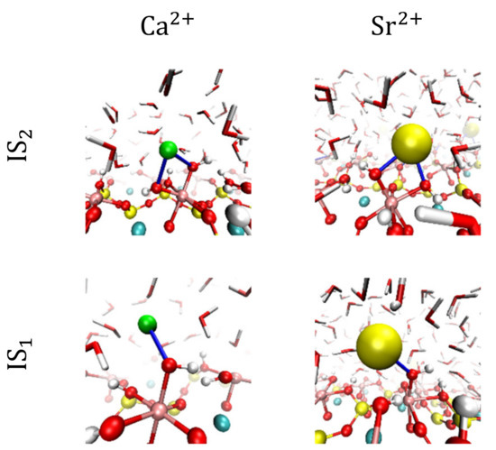 For Ca2+ and Sr2+ inner-sphere complexes are formed almost exclusively with 2 contacts, with a very small population of complexes with 1 contact. The IS2 of Ca2+ and Sr2+ are located between the water molecules of the second hydration layer, while the few IS1 are located between the second and third hydration layers.