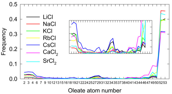 Figure 8 shows the frequency of interactions of each atom in the oleate chain with some atom belonging to the surface of the spodumene. The frequency is considered over a long period of time (70 ns), the higher the frequency, the more stable the contact. The results are revealing, indeed the most frequent contact of oleate with spodumene is by far through its carboxylate group, and it prevails in solutions of Li, Na and Sr. The figure also shows that the lowest frequency of salt bridge-type contacts is for solutions of Cs and Ca, coinciding with the results of Figure 7. The magnification of Figure 8 shows two other types of contacts, although with much lower relative frequencies: the double bond between carbons 26 and 28 and the extreme of the nonpolar tail of the collector. These interactions are not important for contact accounting, but they are from a mechanistic point of view, apparently, cations such as Cs once adsorbed confer some hydrophobicity to the surface of the spodumene. Interesting is the frequency in the presence of Ca, it is not high but when it occurs the oleate compromises a large part of its polar end in contact.