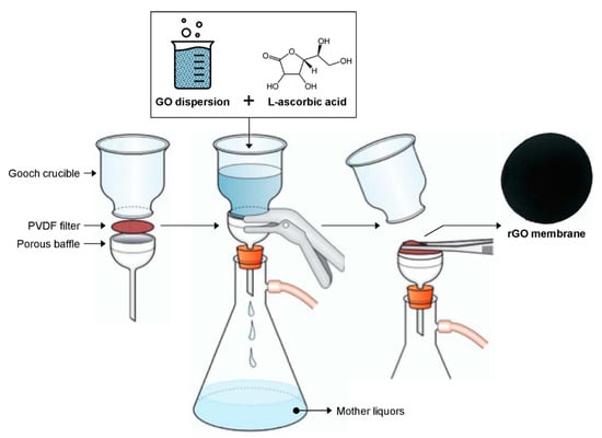 As reported in Figure 1, the suspension containing rGO was poured into a Gooch crucible sealed with a PVDF membrane filter (Millipore, Milan, Italy). Once the crucible was filled, vacuum was applied (water pump) until the formation of a self-standing membrane was completed. The membrane was then dried at 60 °C for 2 h. The same experimental route has also been applied to prepare GO membranes, without performing the reduction by L-AA.