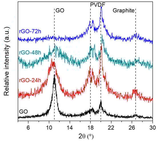 By increasing the reduction time, a progressive broadening of the GO reflection becomes evident; the calculated interlayer distance decreases from 7.98 to 3.3 Å for GO and rGO-48h, respectively, while for the sample reduced 72 h the 11° 2θ reflection is no longer detectable. After a prolonged reduction treatment, the material probably suffers an amorphization and a probable graphitization inception [30]. A progressive formation of graphite in the reduced samples is confirmed by the appearance of an additional reflection, even though wide and slightly pronounced, at 26.7° 2θ [31]. Broadness and intensity of such reflection may be related to graphite formation upon GO reduction. Indeed, in the presented samples graphite probably originates from graphene that, in turn, has been generated during the reduction of GO [32].