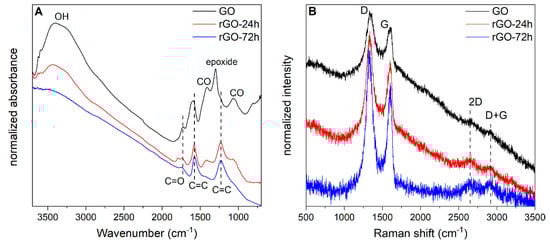 Figure 4. (A) FT-IR spectra and (B) Raman spectra (recorded with the laser line at 632.8 nm) of GO and rGO, reduced for 24 h and 72 h. The bands commented in the text are labelled; the spectra are stacked for the sake of clarity and are reported with normalized absorbance (FT-IR) or intensity (Raman).
