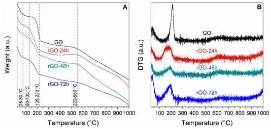 The third thermal phenomenon, occurring in the 135–220 °C range, is accompanied by marked weight losses; for instance, a loss of 25 wt.% was calculated for GO samples (Figure 5A, Table 2). However, the extent of the weight loss decreases by rising the reduction degree. Furthermore, the increasing of the reduction time induced a shift of the maxima of the DTG curves towards lower temperatures (Figure 5B). Temperature range, extent and symmetry of the DTG curve measured for GO (Figure 5B) suggest the decomposition of organic compounds. In particular, this phenomenon can be ascribed to the fast removal of oxygenated functional groups and consequent GO thermal reduction. Similar effects were observed also in rGO samples; however, the features were less intense and broader, with maxima shifted to slightly lower temperatures. The associated weight losses progressively decrease on increasing the reduction time, from 25 wt.% of GO down to 14 wt.% of rGO-72h (Table 2). This phenomenon can be related to the presence of a lower number of oxygenated groups in the material, as expected upon reduction. Moreover, the broadening and the slight shift in the temperature of the maxima could suggest the presence of different thermal phenomena all occurring at very close temperatures, thus associated with oxygenated groups of different nature (i.e., carboxylate, anhydride or lactone ones [40]).