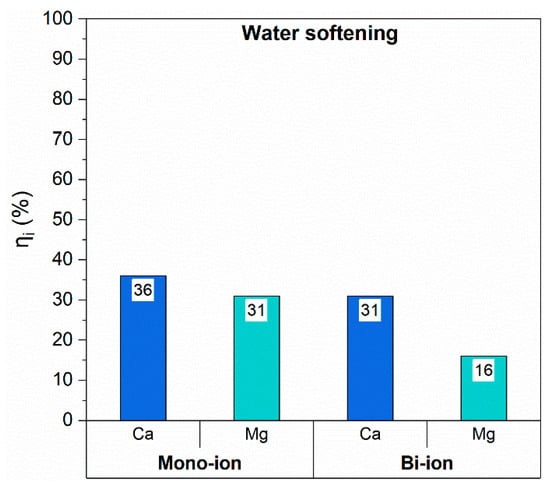 For water softening experiments, the tap water of our laboratory was considered as reference; thus, model solutions containing either Ca2+ or Mg2+ ions were prepared first (1 mmol/L), followed by a bi-ion solution incorporating both Ca2+ and Mg2+ at the same concentration. In Figure 6, the results of filtration tests for both single ion and bi-ionic solutions are plotted in terms of ions capture efficiency.