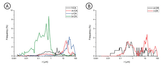 Mercury intrusion porosimetry (MIP) pore size distribution of studied biocalcarenites: (A) fine, f-CA, medium, m-CA, coarse, c-CA, grained, and Bateig, b-CA biocalcarenites and (B) dense, d-CR, and light, l-CR biocalcirudites.