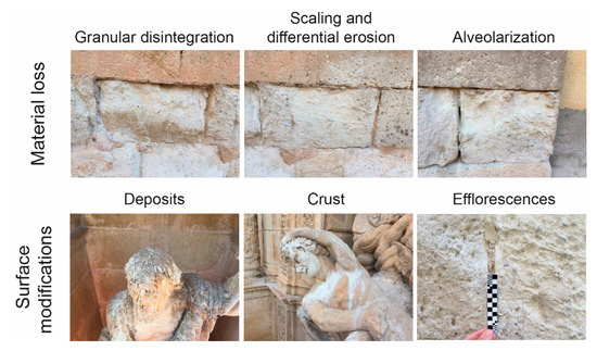 In general, the stone of the monument is in excellent condition, although ashlars of the lower parts of façades and ornamental elements have been subject to weathering and subsequent deterioration. Two main deterioration patterns are observable to the naked eye and have been recognized in the Basilica: surface modifications (efflorescences, crust and deposits) and features induced by material loss (scaling, granular disintegration and alveolarization). The main, or more active deterioration agents are rising capillary water and water lixiviated from pigeon droppings in the portals (Figure 3).