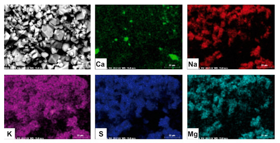 Double salts, mainly humberstonite, have crystal forms corresponding to near-equilibrium form, implying slow crystal growth. Figure 4 and Figure 5 reveal the isometric shape of the humberstonite in the analysed samples. Humberstonite was found to be associated with halite and niter and placed between and/or over them. However, hexahydrite is absent in this mineral assemblage. The near-equilibrium crystal shape suggests they precipitate via incongruent reactions rather than congruent precipitation. Under these dissolution–precipitation conditions, hexahydrite seems to be the precursor and limiting reactant of humberstonite.