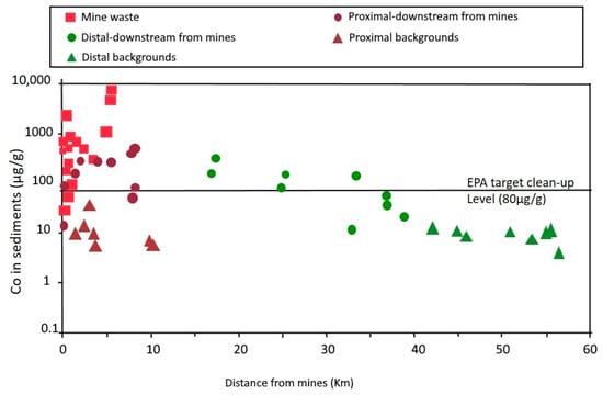 Stream sediment concentration of Co decreasing with increasing distance from mines in the ICB (redrawn after Gray and Eppinger, 2012 []).