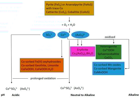 A wide range of geochemical conditions have been recorded in mine waters, resulting in variable Co concentrations being reported (Table 1). High Co concentrations in groundwater, adit water, and runoff are mainly attributed to the weathering and dissolution of sulphide ores and secondary minerals in regions of acidic pH. The oxidation of pyrite, and conversely the reduction of Fe, can cause Co and other trace elements to be released from the tailings and other solid mine wastes. According to (Krupka and Serne, 2002) [], Co2+ (aq) tends to be the most dominant aqueous species under geochemical conditions, typically encountered in the natural environment (Figure 2). Studies conducted in Kabwe, central Zambia, where local Pb and Zn ores were mined and processed from 1903 to 1994, have indicated that high concentrations of Co (34,400 mg/L) occur in water flowing from the leach plant at pH 2.89 []. At such pH, the oxidation of carrolite ((CuCo)2S4) can act as a source of dissolved Co in mine waters []. High concentrations of Co (0.5–2028 µg/L) also have been recorded in surface waters in Cobalt (Canada) []. These have been attributed to the dissolution of secondary minerals such as erythrite and annabergite at pH ~2 [,]. According to Zhu et al., (2013) [], erythrite solubility typically exhibits a strong inverse correlation with solution pH. Cobalt and As dissolution is suggested to proceed via the following reactions []: