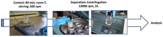 After both uptake and release operations, the solid and liquid phases were separated by centrifugation at 13,000 rpm for 1 h (HETTICH 32 RotoFix centrifuge, Hettich, Westfalen, Germany).