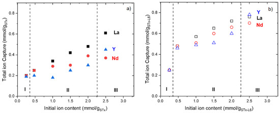 Y, Nd, and La, captured by both sorbents via the exchange mechanism as a function of the initial ion contents, are plotted in Figure 3a,b.