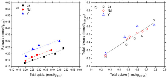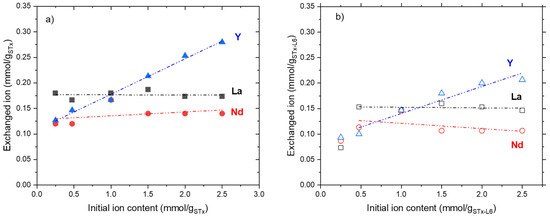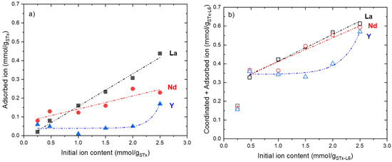 As already reported [20,21,24], the adsorbed amount of ions for STx and the adsorbed and coordinated amount for STx-L6 can be calculated according to Equation (2), by the difference between the total and exchanged uptakes. The results are reported in Figure 4a,b. Once more, the behaviour of the two sorbent solids was very close: La and Nd showed a linear trend, while Y showed a constant adsorption. The sharp increase of Y uptake at the highest concentration can be related to the surface adsorption of Y ions in excess of what can be exchanged or coordinated. In the case of STx, only the adsorption contribution was present, while the higher capture, observed in STx-L6, was due to the additional coordination effect of polyamine. Regarding the capture by STx-L6, it was not possible to separate the contribution of the coordination and of the surface adsorption.
