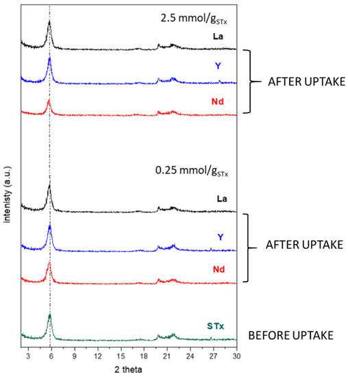 No shift of the basal reflection was apparent; thus, no modification of the interlayer distance was observed, suggesting that the close similarity among the ionic radii of La, Nd, Y, and Ca possibly prevent an appreciable interlayer change. Therefore, XRD is unable to distinguish among the different interlayer cations. Regarding STx-L6, very limited shifts have been reported in the literature in the case of La capture from solutions of similar compositions as those reported here [24]. Combining different characterization techniques, it has been demonstrated that changes in d001 were related to the interlayer water molecule displacement upon intercalation of the La ions. Therefore, XRD analysis in this case was unable to differentiate the ions. Accordingly, further XRD analyses on the solids exchanged with Y and Nd were not performed.