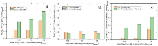 Preliminary tests on multi-ion solutions were also performed to evaluate a possible “matrix” effect, which can imply different speciation in the solution, preferential adsorption, or ion competition. In Figure 7, the total (a), exchanged (b), and adsorbed or adsorbed and coordinated (c) uptakes on both STX and STx-L6 at increasing ion contents are plotted. In the initial solutions, the ratio among the ions was always kept: La/Nd/Y = 1/1/1 (mmolion/gsorbent).