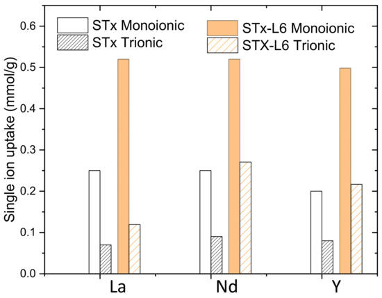 La, Nd, and Y uptakes by pristine STx and modified STx-L6: comparisons between the single ion and trionic solutions (solution ionic concentration = 0.5 mmolion/gsorbent).