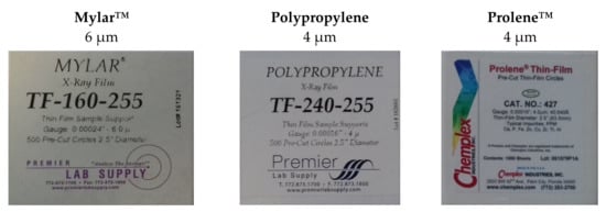 - Wilson, A.W.; Turner, D.C.; Robbins, A.A. Evaluation of Some Sample Support Films for Microsample X-Ray Analysis. Mater. Sci. 1999, 301–307. [Google Scholar]