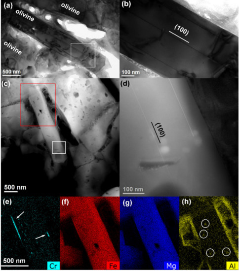 Figure 1c,d, the olivine grains also contain numerous low-Z contrast inclusions (darker regions) consisting of Al-rich spinel, indicated with circles in the STEM-EDX map in