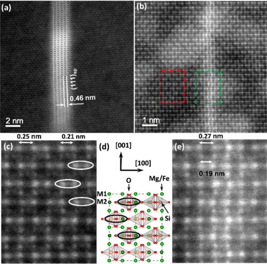 32]. If the temperature is sufficient to allow atomic mobility, the Fe trivalent cations segregate and contribute to the exsolution lamellae growth. When the lamellae became thicker, they adopted a spinel-like structure with epitaxial relationships with the host olivine. Both structures share their hexagonal close packing of oxygen ions according to the structural relationships (100)