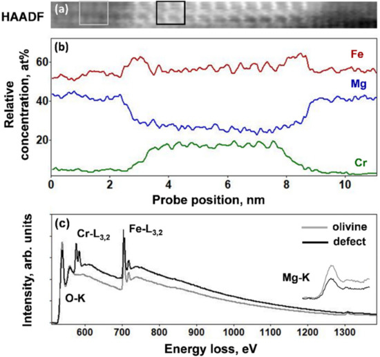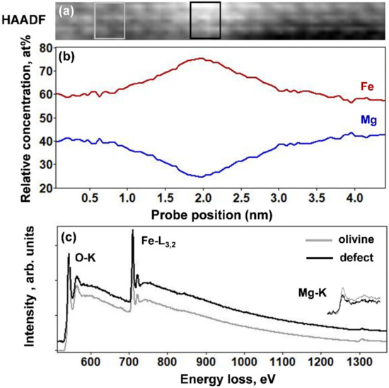 3,2 edges, together with the EELS spectra in the energy range between 500 and 1400 eV for the olivine and the defect. The EELS profiles clearly show an increase of the Fe concentration accompanied by a decrease in the Mg content. These concentration modifications concern a ~2-nm-thick area and they are highest within a peak region with 0.75 nm width. The Fe and Mg ratio in the olivine, expressed as Fe/Σ(Fe + Mg), was approximately 0.58, while it corresponded to 0.74 within the four atomic planes of the thin defect. This was in good agreement with the increase in HAADF intensity within the 2–4 atomic planes of the defect. Chromium, present in abundance in the thick platelets, was not detected in the thin planar defects.