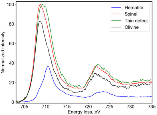 Figure 5 for both the olivine matrix and the hematite were plotted with their respective spectral contributions deduced from the best fit of the experimental spectra for the thin defect. This suggests that the augmentation of the Fe concentration in the thin planar defects was accompanied by a change in the oxidation state towards Fe