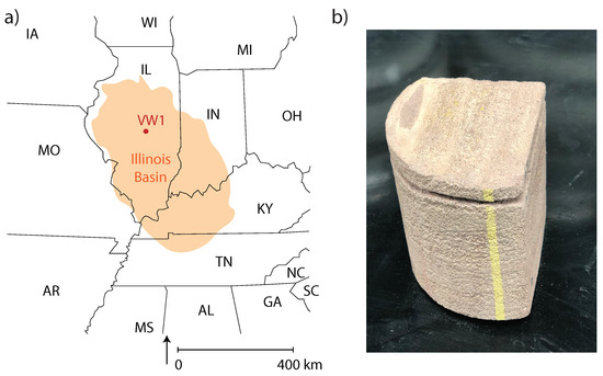 Mt. Simon sandstone specimens were extracted from the CO-storage zone, via Verification Well 1, in the Illinois Basin—Decatur Project. Figure 1a displays the site location of the Illinois Basin-Decatur Project: It is located in East-Central Illinois and in northern part of the Illinois Basin. Two cores were extracted from Verification Well 1 at two depths: 6925 ft. (2110.7 m), and 6927.55 ft. (2111.5 m). The two cores were sub-sampled in quarter cylinders of a radius of 40 mm, and a height of 80 mm. Figure 1 displays a representative digital photographic image of a core (as extracted).