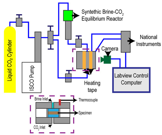 The core sub-samples were organized into two sets: reference samples and samples for incubation with CO/brine. The latter samples were jacketed in a Teflon liner and incubated in CO-saturated brine at a temperature of 50 C and under a pressure of 17.2 MPa for one week. The experimental set-up for sample incubation is shown in Figure 2 [7]. A hollow stainless steel cylindrical tube was utilized for sample incubation. The teflon liner, surrounding the core, served to prevent any interaction between the CO-saturated liquid brine and the stainless steel casing. After sealing the incubation cell using Teflon O-rings, four ports on the cell were utilized to inject the brine, to inject supercritical CO using a Teledyne Isco fluid pump, to allow for pressure release, and to monitor the fluid pressure, respectively. Finally, the temperature of the incubation cell was monitored using a set of thermocouples.
