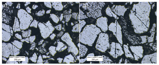 We assessed the quality of the grinding and polishing procedure using optical microscopy and surface contact profilometry. Figure 3 displays representative optical microscopy images of unaltered Mt. Simon sandstone. Optical microscopy was conducted using a Nikon optical microscope with a 200× optical lens. For all Mt. Simon sandstone specimens, the microstructure is heterogeneous, porous, and granular with grains in the range of 50–500 m. After grinding and polishing, we stored the polished specimens under vacuum for further micro-analysis and nano-mechanical testing.