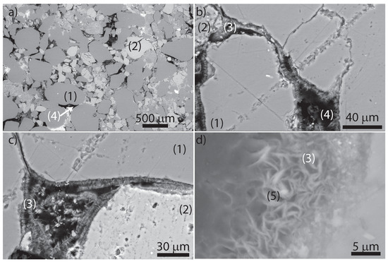 Microstructural characterization of unaltered Mt Simon Sandstone samples, 6925-U: (1) quartz grain (dark gray); (2) K-feldspar grain (light gray); (3) clay; (4) macropore; and (5) micropore. Magnification: (a) 55×; (b) 1054×; (c) 1149×; and (d) 6361×.