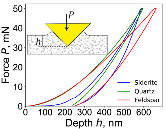 Grid nanoindentation tests were conducted on both unaltered and altered Mt Simon sandstone specimens using an Anton Paar nano-hardness tester with a Berkovich probe. Each indentation grid consisted of an array of 21 × 21 indents with an inter-indent spacing of 50 m. Each indentation test was conducted at a maximum load of 50 mN, a loading/unloading rate of 100 mN/min, and a holding period of 5 s. Figure 5 shows representative load–depth curves for indents on siderite, quartz, and K-feldspar. For each indentation grid, a Gaussian mixture model [7] was applied to assess the distribution of microstructural phases, given the measured values of the indentation modulus and indentation hardness.