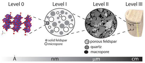 Figure 6 illustrates our multi-scale conceptual model for the Mt. Simon sandstone from the molecular level to the core level, at the centimeter lengthscale. At the molecular level, or Level 0, our fundamental unit is a potassium feldspar crystal. At the nanometer lengthscale, feldspar is intermixed with micropores. The morphology is statistically disordered. At the microscopic scale, porous feldspar grains are mixed with macropores, quartz, and siderite grains. Finally, at the centimeter lengthscale, the core resembles a homogeneous block.