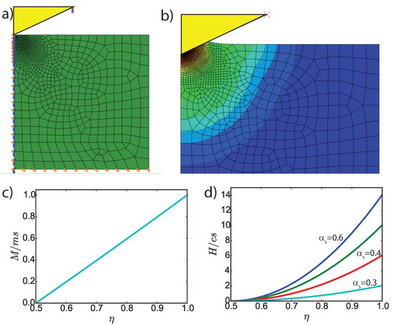 Hardness-packing density relationships at Level I. (a) Numerical simulations of indentation test: initial configuration. (b) Close-up of the deformed configuration for indentation test simulation. The yellow triangle represents the rigid conical indenter. (c) Theoretical indentation modulus-packing density curve for . (d) Theoretical indentation hardness—packing density curves for and various values of . H is the indentation hardness, M is the indentation modulus, is the plane strain modulus for the solid skeleton, is the solid skeleton cohesion, is the solid skeleton Poisson’s ratio, and is the solid skeleton coefficient of internal friction.