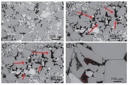 The micro-structure was further resolved using an environmental scanning electron microscopy FEI Quanta 650 equipped with a backscatter detector under low vacuum at an accelerating voltage of 20–25 kV and a walking distance of 10 mm. Figure 4 shows backscattered environmental scanning electron micrographs of an unaltered Mt. Simon sandstone sample. A multi-scale, heterogeneous, granular, and porous micro-structure is observed. Figure 4a shows grains with a size ranging from 50 to 500 m. Quartz grains are shown in dark gray in Figure 4a–c. Pre-fractured K-feldspar grains are shown in light gray in Figure 4a–c. Figure 4a,b shows microscopic pores with a pore throat size of 20–50 m. Figure 4b,c shows clay minerals surrounding both quartz and feldspar grains. Figure 4d shows micropores with a pore throat size in the range 500–700 nm.