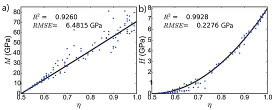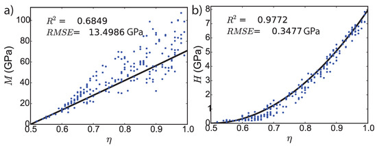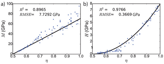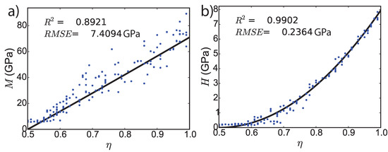 Experimental calibration of theoretical model at Level I with nanoindentation tests on Mt. Simon sandstone 6925-U ( indentation tests). (a) M is the indentation modulus, (b) H is the indentation hardness. is the local solid packing density, and is the local microporosity. The blue dots represent the experimental data points, whereas the solid line displays the theoretical solution. is the coefficient of determination and is the root mean square error.