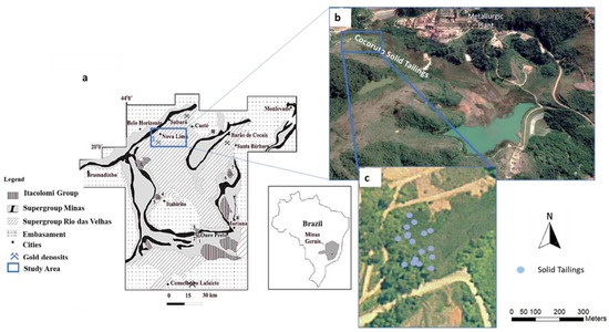 Location of the study area and Iron Quadrangle map (a) [43,44]; (b,c) Images of the Cocoruto Dam sampled area (SIRGAS2000—10-09-2019).