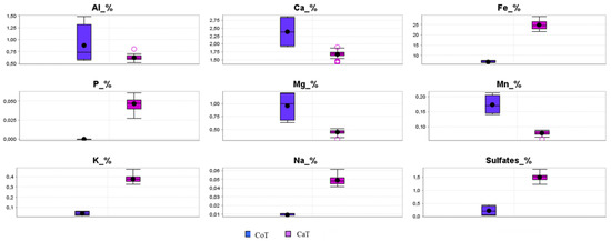 Table 1 and Figure 2 show the composition of the tailings. The elements were selected primarily based on the environmental relevance and inclusion in the Brazilian legal framework as well as potential economic interest. The samples from the ongoing process (CaT) comprise the following major elements, according to the decreasing order of their average concentration: Fe > Ca > Al > Mg > K > Mn, Na. The samples from the old Cocoruto dam (CoT) contain higher levels of Mn than CaT tailings: Fe > Ca > Mg > Al > Mn > K, Na (Table 1 and Figure 2). A relative depletion of the iron concentrations could be verified for the tailings deposited historically in the Cocoruto Dam. The elements Na and, especially K, on the other hand, had an enrichment of the order of 3× and 10×, respectively (Table 1 and Figure 3).