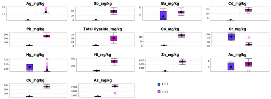The trace elements with environmental interest [40] presented the following decreasing order of their average concentrations for CaT: (As > Zn) 10 mg/kg > (Cu > Ni > Pb > Co) 102 mg/kg > (Sb, Cr, Ba, Cd) 101 mg/kg and CoT (As) 103 mg/kg > (Zn) 102 mg/kg > (Cr > Cu > Ni > Pb > Hg) 101 mg/kg. The As followed by Zn remained as the main trace elements of environmental interest in the samples of tailings collected both in mineral processing and in the Cocoruto Dam (Table 1 and Figure 4). The element Hg was not detected in the CaT samples, but it had an average content of 21 mg/kg in the samples from the Cocoruto Dam.
