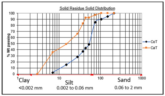 In general, the grain size distribution (Figure 5) is similar to other dams that store tailings from Au exploitation [7,8,27,53]. The tailings presented 80% of their particles classified as silt-sized (Figure 5). The CoT samples are shown to have a thicker distribution than the ongoing process tailings (CaT). The difference can be explained by changes in the grinding process and different features of the ore sources and their variability [30]. In addition, the samples that represent CoT originate from older circuits, which have low grinding efficiency when compared to the ongoing one (CaT).